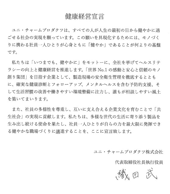 ユニ・チャームプロダクツ株式会社は、社員一人ひとりの心と体の健康を企業の重要な基盤と考え、2025年12月に「健康経営宣言」を制定しました。